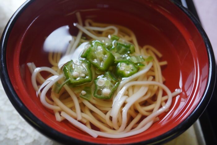 七夕らしくそうめん汁を提供。切り口が星型に見えるオクラを星に見立てて、七夕の夜空に浮かぶ天の川と星をイメージしています。
