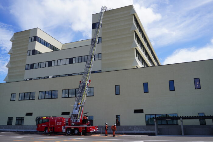 2023.8.15 新病院の消防関係を確認しました この記事の関連タグ: 地域情報地域連携新病院移転最上広域消防本部県立新庄病院 新病院開院まで2か月を切りました。開院が待ち遠しいですが、8月7日(月)、8日(火)に、新病院で火災や事件等不測の事態があった場合を想定し、救助方法等について最上広域消防本部の方が現地で確認を行いました。 新病院は地上6階建ての建物であることから、はしご車をどこに設置すれば、迅速かつ安全に高層階の患者さん等を救助できるか、実際にはしごを伸ばして確認しました。 この記事をシェアする \友だち登録お願いします/