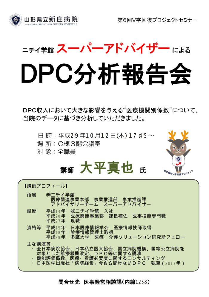 10月12日に今年度の第6回V字回復プロジェクトセミナーとして、DPC分析報告会を開催しました。 ・