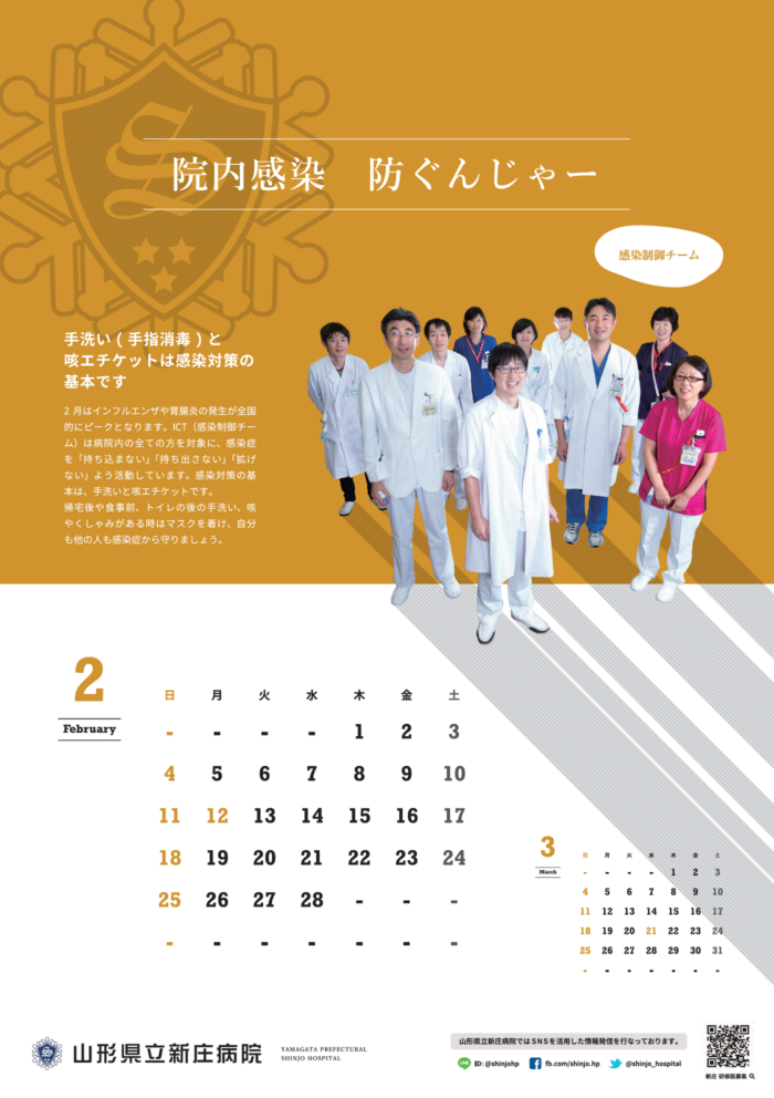 2018.2.1 新庄病院 2月カレンダー この記事の関連タグ: 2月募集新庄県立病院研修医 当院の2月分のカレンダーを掲載しますのでご覧ください。 病院職員が一丸となって、地域住民の皆さんに安心・安全・信頼の医療を提供してまいります意気込みを表しております。 引き続き、県立新庄病院をよろしくお願いいたします。 今月は「感染制御チーム」です。 この記事をシェアする \友だち登録お願いします/